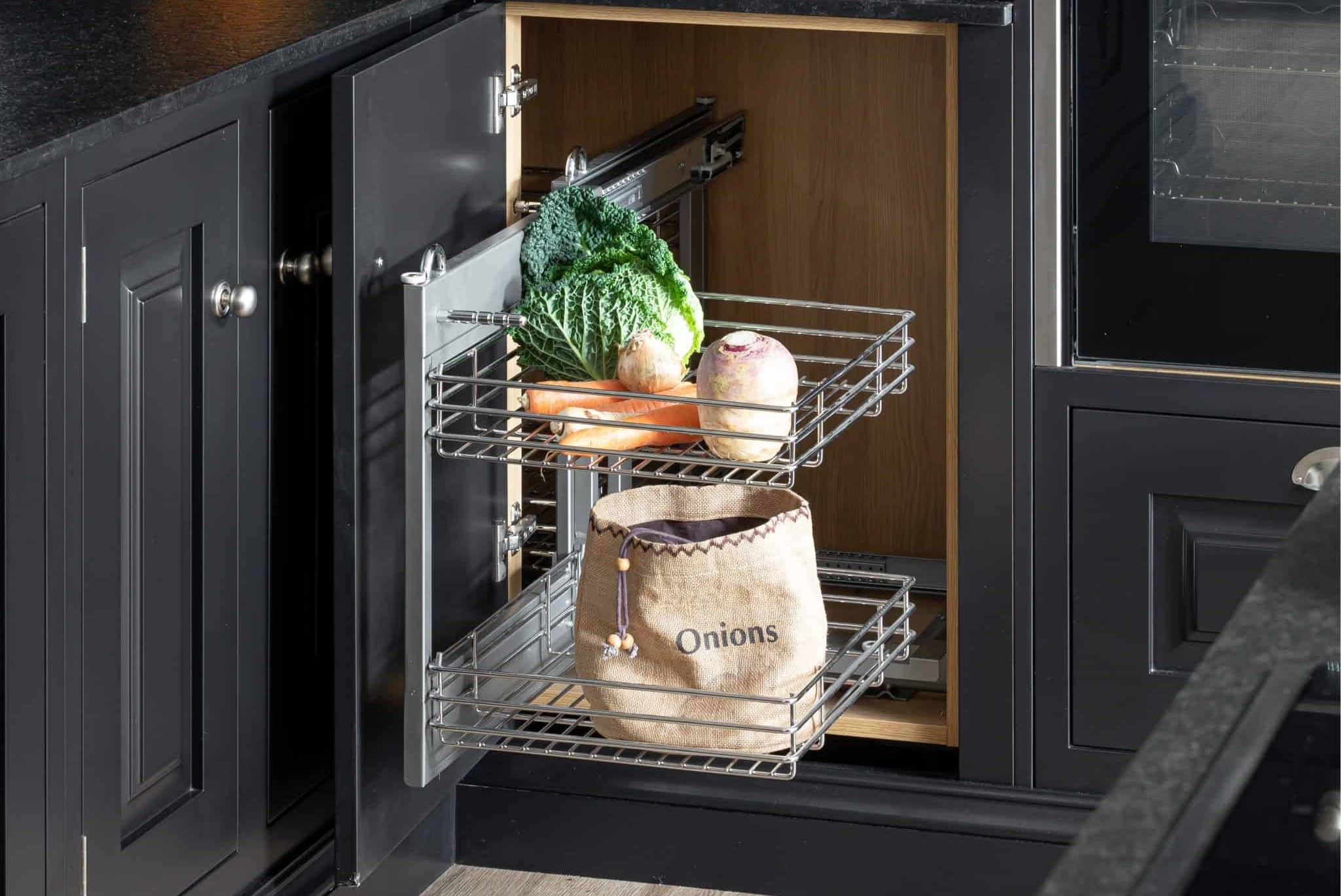 Start by going vertical – use your walls for shelves, hooks, and hanging racks. Inside your cabinets, invest in tailored solutions like pull-outs, drawer dividers, and integrated appliances. Every choice should reflect how you cook, prep, and live in the space.