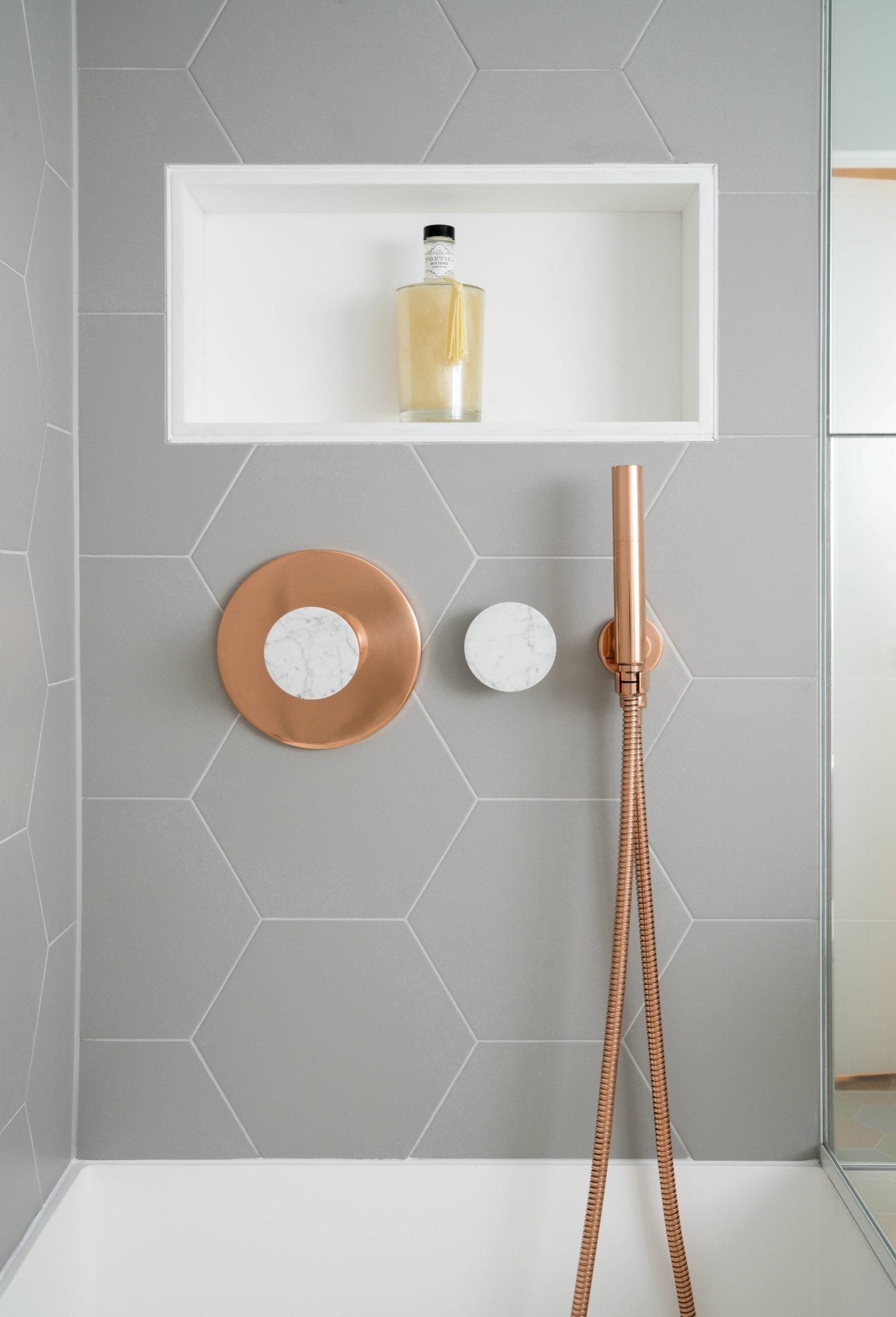 Our client wanted this compact bathroom to appear more spacious, with a distinctly ‘feminine’ feel.