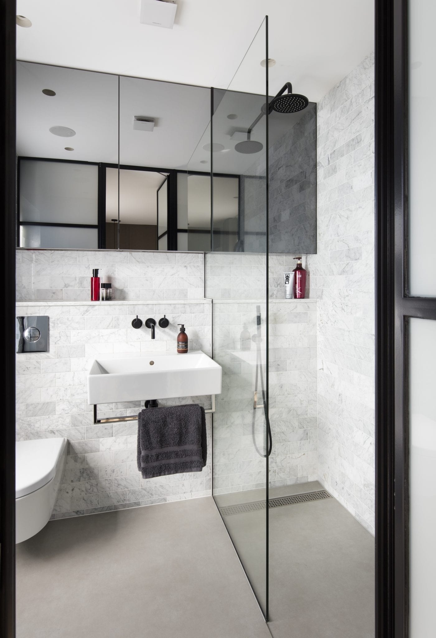 The mirrored wall cabinets reflect the natural light entering the space to give the illusion of more space.